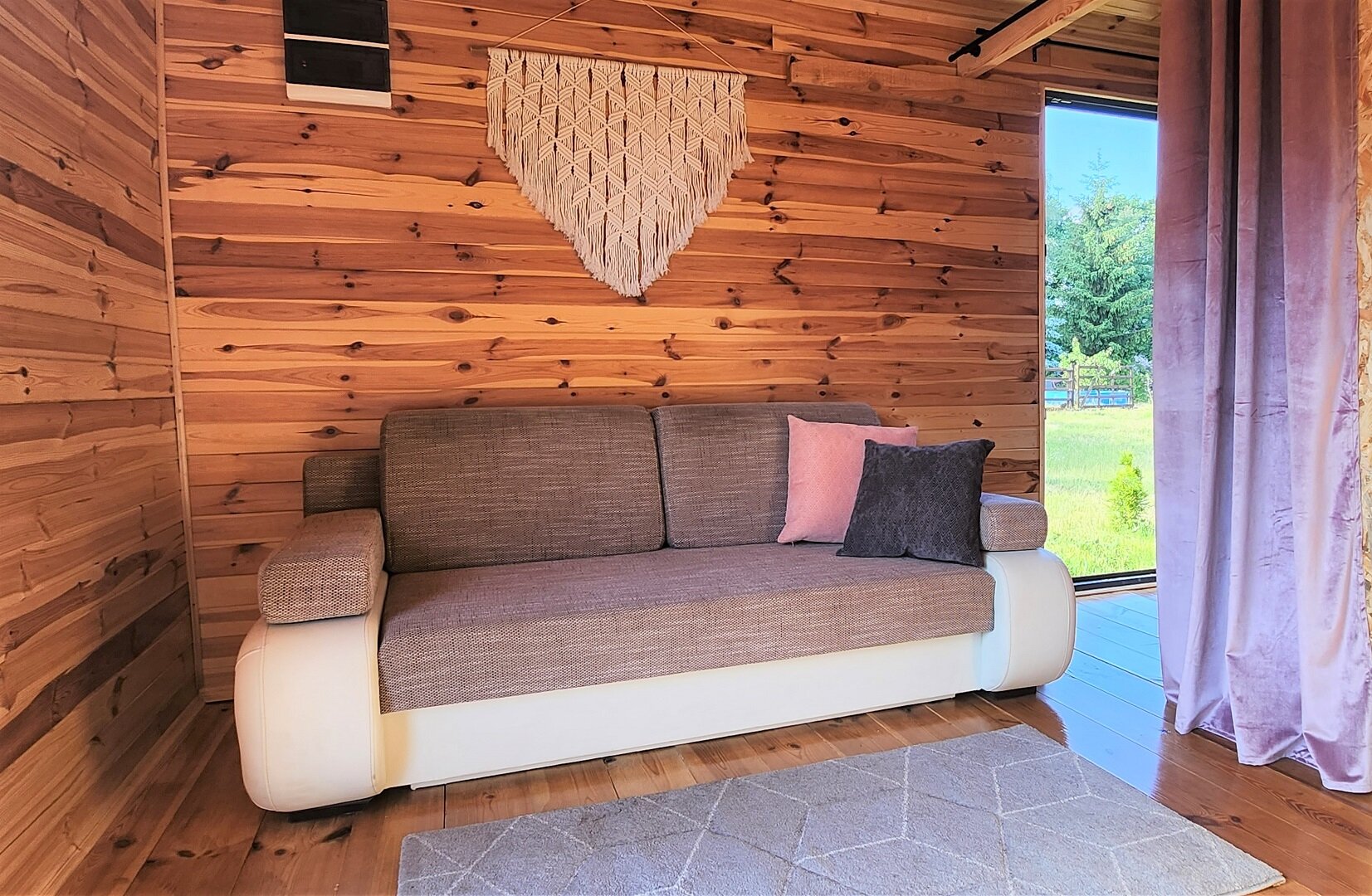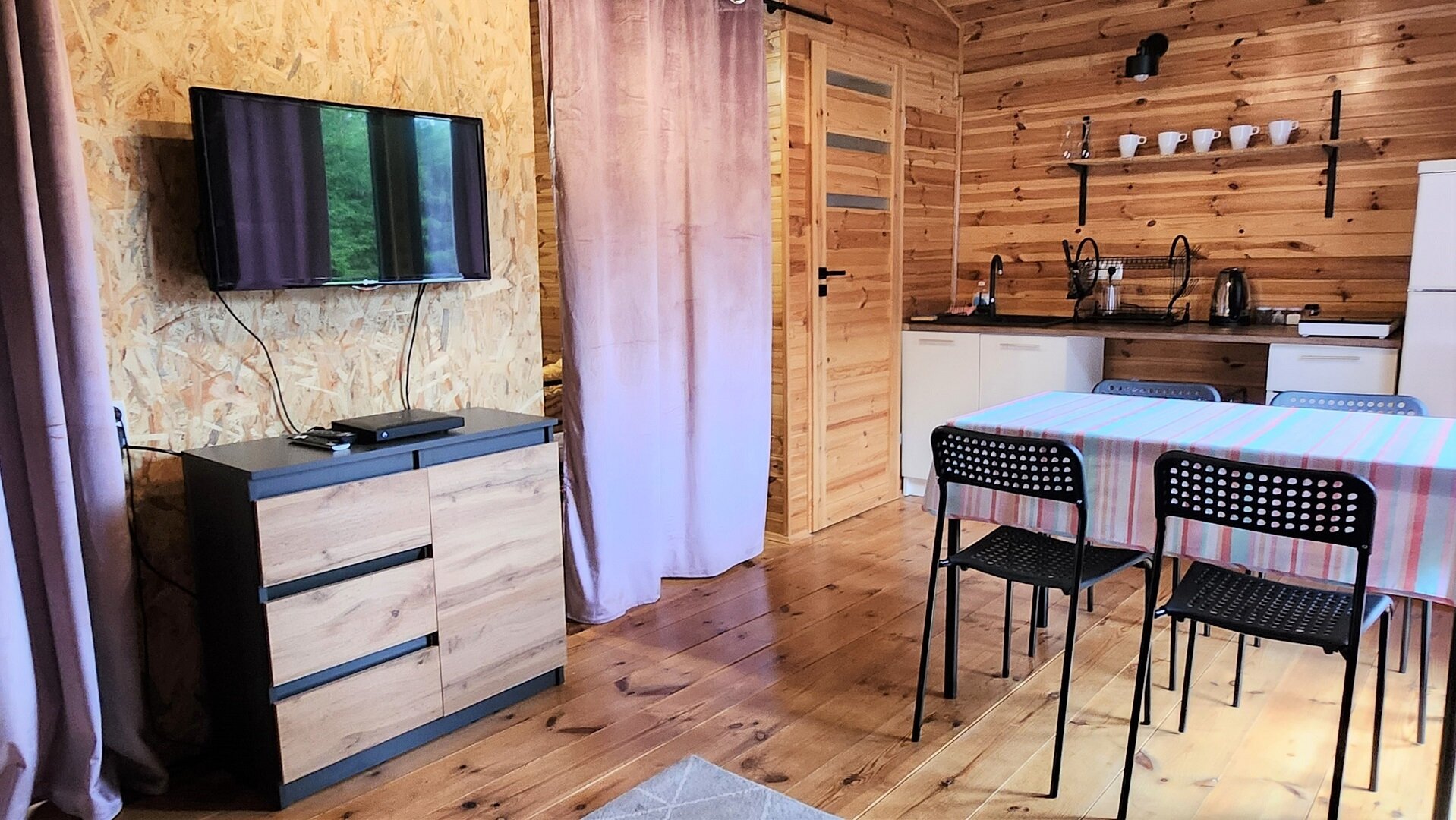 Domek wyposażony jest w 4 miejsca noclegowe. Dwa łóżka pojedyncze znajdują sie w części sypialnej, natomiast w części dziennej stoi rokładana, dwuosobowa kanapa. Pomieszczenia oddzielone są od siebie ścianką i zasłonami. Z każdego z nich można wyjść na zewnątrz. Poza tym na wyposażeniu domku znajdują się: stół z krzesłami, szafa, komoda, telewizor, lustro, ręczniki. Aneks kuchenny posiada  niezbędne naczynia i akcesoria. Łazienka wyposażona została w wc, umywalkę i kabinę natryskową.
