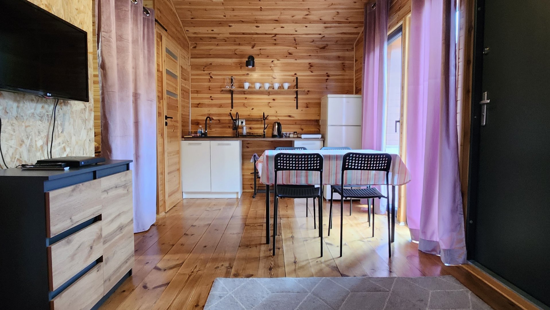Domek posiada powierzchnię 35 metrów kwadratowych, na której znajduje się taras, przestrzeń dzienna, cżęść sypialna, aneks kuchenny i łazienka.
